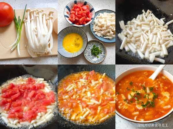 2、准备少许的白玉菇,洗净之后切成小段备用,再准备少许的葱花。热油锅,先放入白玉菇煸炒,把白玉菇里面的水分炒干,然后倒入西红柿翻炒。