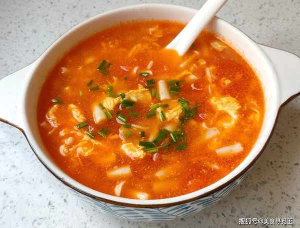 3、等翻炒出汁水后,加入适量的开水,淋入蛋液,加入少许食盐,白糖,鸡精,生抽调味。最后出锅后撒少许葱花点缀一下即可。