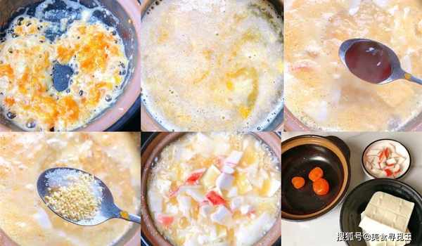 2、锅中倒少许食用油,油热之后先放入咸蛋黄煸炒出油脂,然后倒入适量的开水,大火煮开,倒入豆腐和蟹柳炖煮3-5分钟。