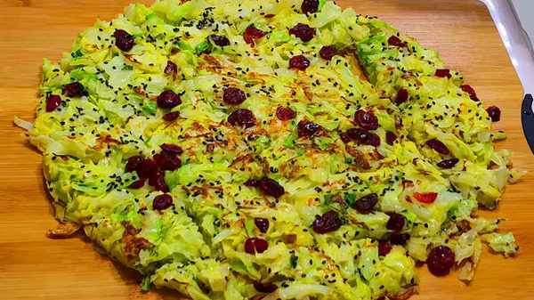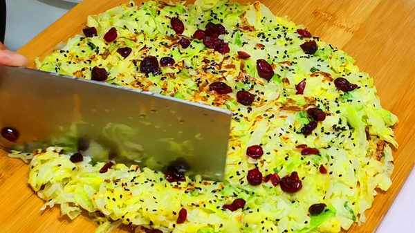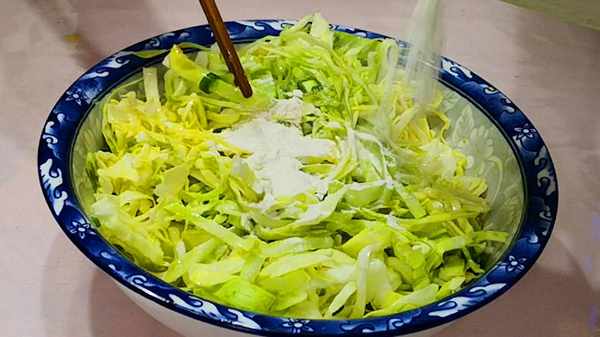 1.包菜1个去根洗净,切成两半后再切成细丝,然后放入碗中,打入2个鸡蛋,加入一匙食盐,一匙胡椒粉和一把葱花,搅匀后再倒入半碗面粉,搅拌成粘稠的糊状后再加入少许食用油,再次搅匀后备用。