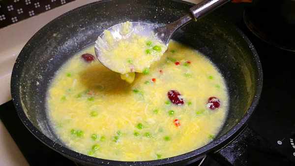 2.然后起锅再加入一碗清水,倒入玉米蓉,再加入适量的红枣、枸杞和鲜豌豆类,搅拌均匀后开始煮。
