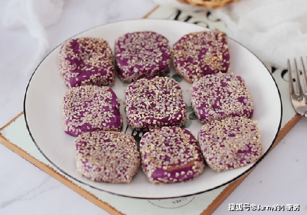 紫薯去皮,冲洗后切成片,放进锅内蒸熟。芝麻倒进盘内待用,一次不用倒太多,等不够用了再倒就行。