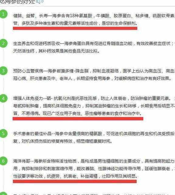 海参一直是大人小孩的滋补佳品,小孩吃了,能增强健脑益智,为婴儿大脑提供神经发育的的脑黄金物质,大人吃了增强免疫力,抑制肿瘤,还能抗衰老补肾益精,被称为海洋伟哥,