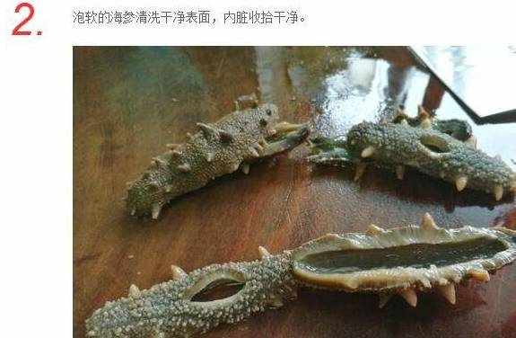 然后把已经泡软的海参切开,处理内脏,清洗干净,