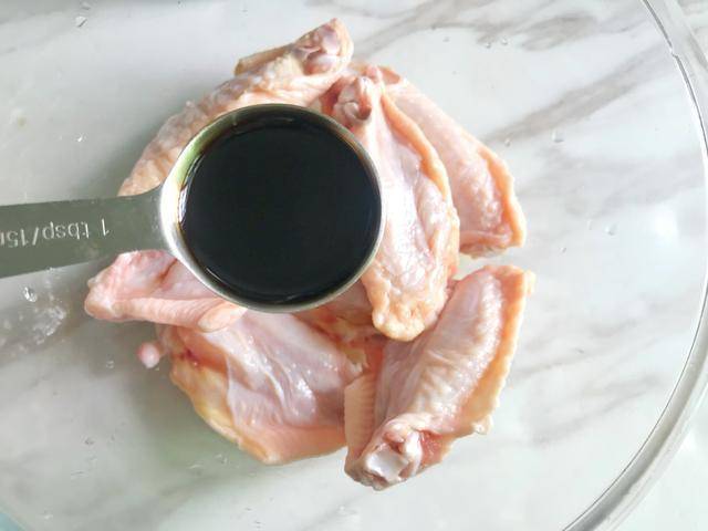 步骤二:用生抽和料酒一起搅拌好,让鸡翅匀称的裹上调味料。