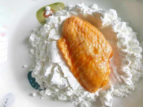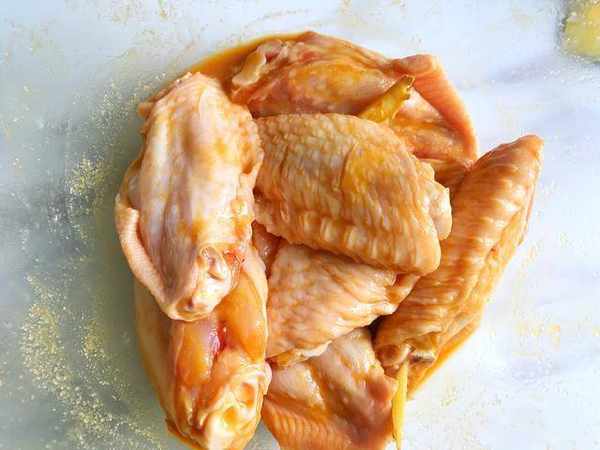 步骤五:腌制鸡翅最起码要一小时以上,这样才能够让味道更好的进入到鸡翅中。腌好之后放到淀粉上裹上一层。