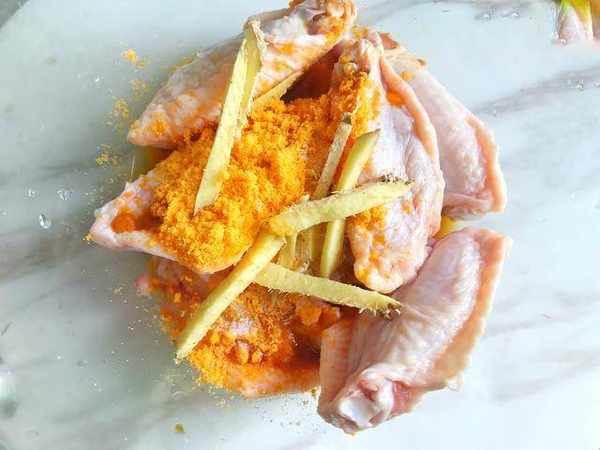 步骤四:加入适量的盐和姜丝,这也是为了能够让鸡翅更好味一些。