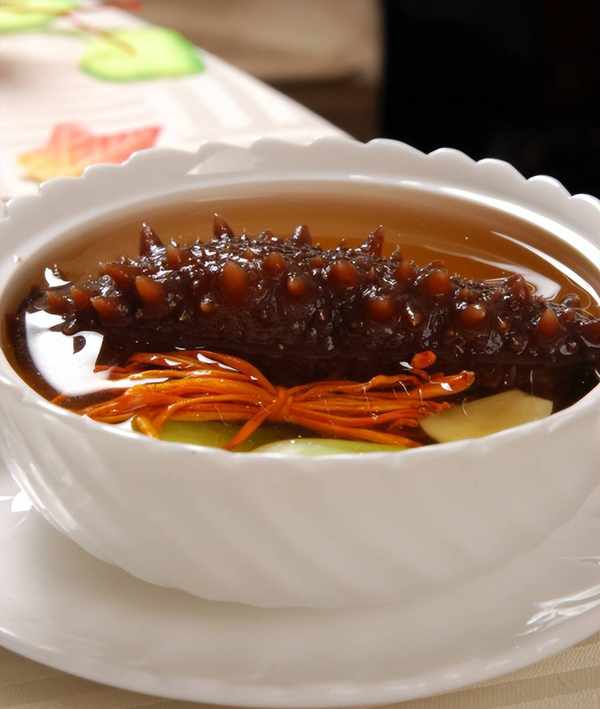 炖海参的汤是鸡汤做的,鸡汤比较淡,不像鱼汤那么乳白浓稠。廖先生现在60岁了。他平时非常重视饮食健康,所以他喜欢吃一些清淡营养的食物。这种海参汤是他的最爱。