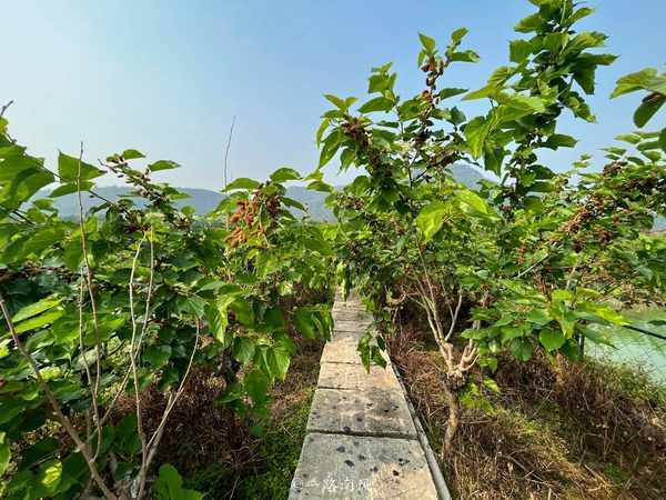 佛山的桑葚虽然很多,但连绵成片且开发成景区让游客自由采摘的并不多,到南海区西樵镇旅游,我们特地打卡了渔耕粤韵生态园,这里有一大片栽种于鱼塘堤围的桑树,每棵树的枝头都挂满桑葚,看起来特别诱人,有的桑葚竟然是心形的,自然万物实在太神奇了。