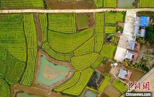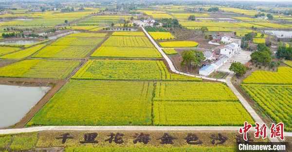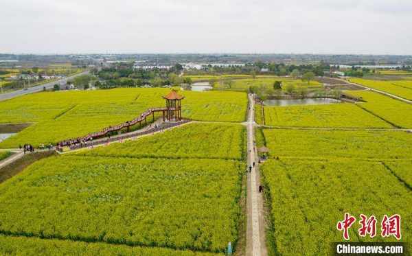 3月17日,航拍湖北沙洋县曾集镇张池村油菜花田。近日,湖北荆门沙洋县油菜花相继开放,遍地金黄,呈现一派春意盎然的美丽景象。湖北荆门沙洋县是“中国菜籽油之乡”,油菜种植面积达73万亩,油菜集中度和产业化经营水平均居国内前列。