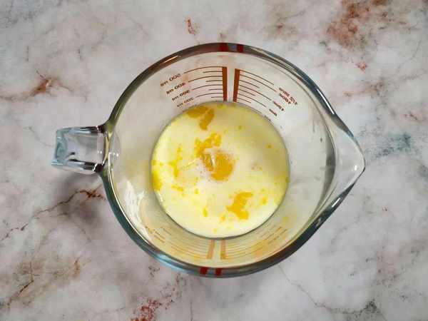 3. 蛋黄中加入牛奶、玉米油,搅拌乳化。