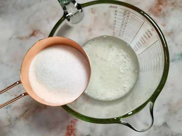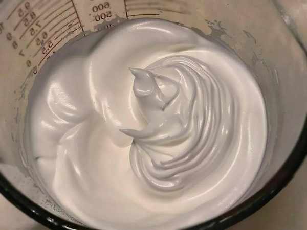 5. 蛋清盆中加入几滴柠檬汁开始打发。分三次加入细砂糖。