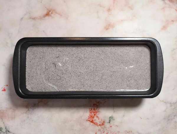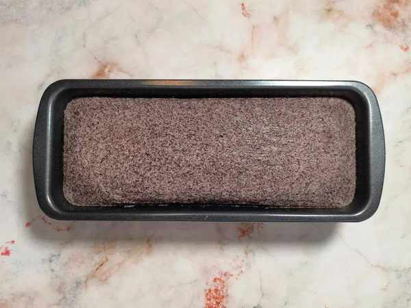 9. 将黑米蛋糊倒入摸具中,此处也可以使用戚风模具。将模具震几下去掉大气泡,然后盖上保鲜膜,放入蒸锅中,中大火蒸30分钟。烤好取出,挤沙拉酱、蕃茄酱即可!