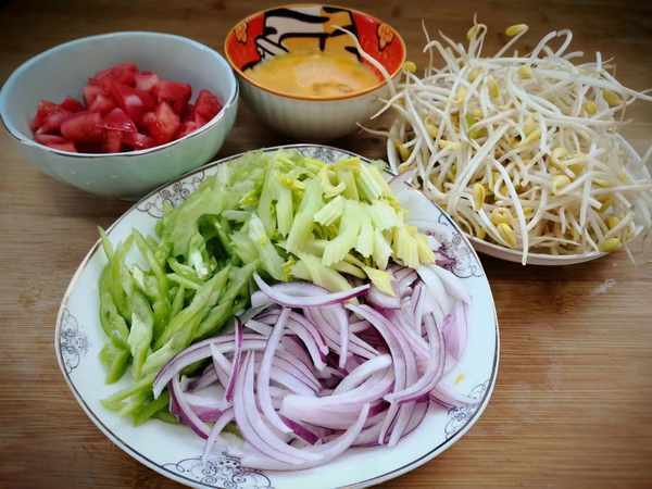 3、准备一个西红柿去皮切块,两个鸡蛋打散,适量黄豆芽洗净,半个洋葱切丝,2根青椒切成丝,2个芹菜杆切段。