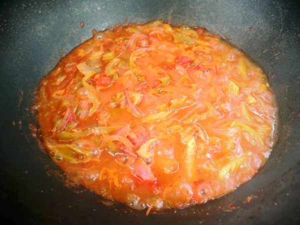 6、锅中倒油,油热倒入鸡蛋液,炒熟盛出,炒锅里再放少许食用油,倒入西红柿块和少许番茄酱炒出汤汁,加入适量的辣椒面,翻炒片刻,加入洋葱,青椒,芹菜翻炒半分钟,加盐,鸡精,味精,五香粉调味,再加适量清水烧开。