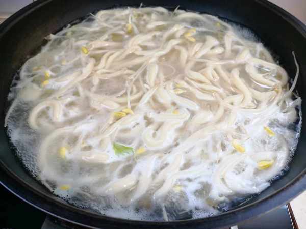 4、我们烧一锅水烧开,面条醒好后,取出放到案板上,继续往细搓一下,再在上面撒点面粉,将拉条子缠绕在双手上,稍微用力在案板上把面条摔打拉抻,这样就可以直接下入开水锅里,豆芽和面条一起下入锅中煮熟。