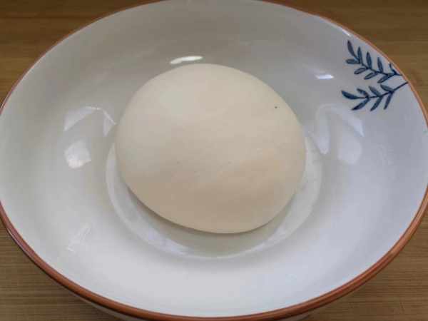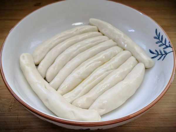 2、30分钟后把醒好的面拿出来,揉成光滑的长条,切成大点剂子,再搓成细的圆条状,盆底均匀地抹上一层食用油,将搓好的长条放在盆里,面条上抹上食用油,盖上保鲜让其充分醒面1小时左右,时间越长面条越筋道。