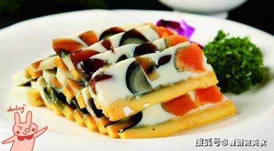 (1)将松花蛋剥壳儿,对切,同咸蛋黄一起放入方形容器中。