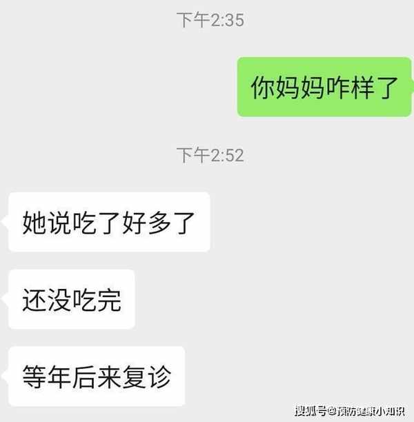 給她講完後,她有一點同意我的說法,但是還是不能完全同意,因為沒有看到效果。我告訴她,吃兩周的藥再來複診吧,她半信半疑的回去了。幾周後,我給她女兒發了消息,問了她的情况,告訴我好多了,藥還沒有吃完,但已經知道和血管瘤沒有關係了。