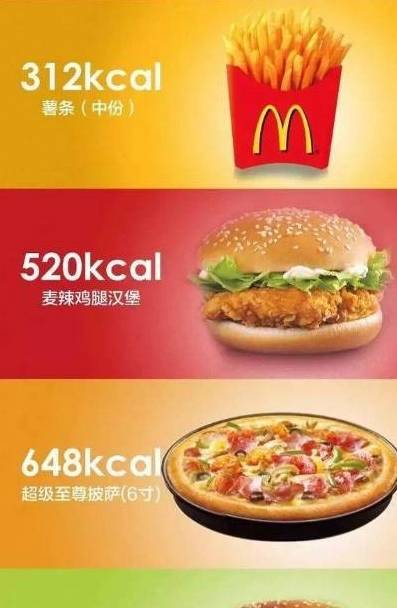 一包中薯条的能量大概是320千卡左右,一杯300毫升左右的中可乐的能量大概120千卡左右。这样算下来,一餐的能量就有点离谱了,要达到900—1100千卡左右一餐,很显然,这一餐就超标了。