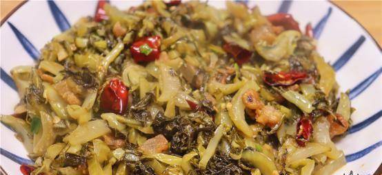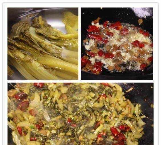 【材料】:芥菜、淘米水、盐、鸡精、猪油、干辣椒、大蒜