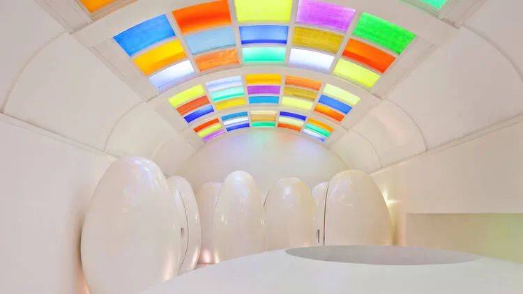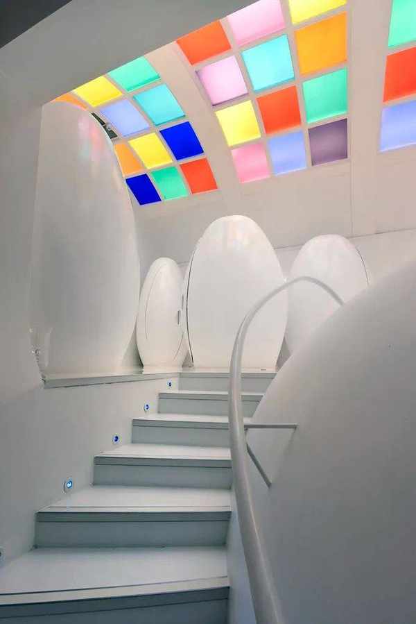 他家的厕所很有“看点”, 彩色色块的屋顶,超有设计感的楼梯,一颗颗鸡蛋的模样的“厕所单间”,有种太空舱的既视感,大家更会听到唧唧虫声和啁啾鸟语等大自然的天籁之音,彷若置身绿野仙境的丛林间。