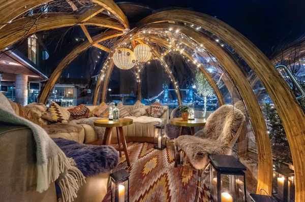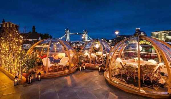 梦幻的玻璃房,木质地板+竹藤椅子+各色抱枕,夏天的时候,装饰上绿色的植物是小清新的画风,而到了圣诞节配上毛茸茸的毯子和沙发,暖暖的灯光透出来又有点像爱斯基摩人的 Igloo 小屋,每个小屋里配备给力的供暖和听歌的音响,再加上美到不行的泰晤士河夜景,圣诞气氛满分。