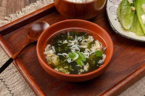 5、加入焯过水的紫菜,煮至汤开后加入盐、味精和青葱,即可食用。