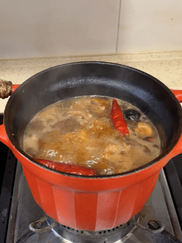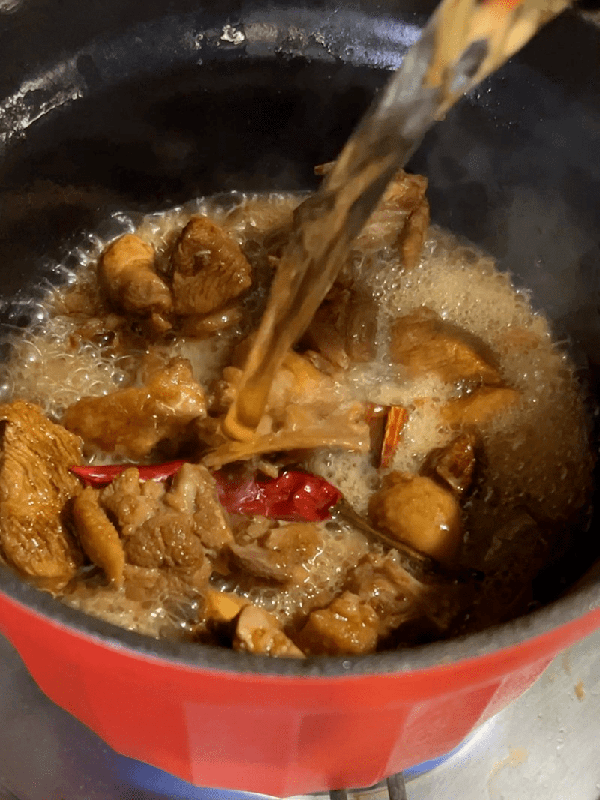 3、等煸干水分,鸭肉开始出油后倒入少量油,放八角大料等香料一起煸炒, 放两个辣椒,最后放生抽老抽等其他调料,煸炒到鸭肉微微焦黄,准备换锅。