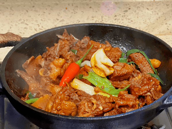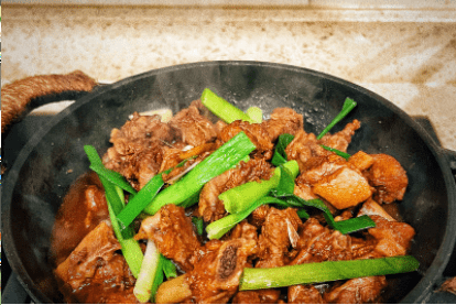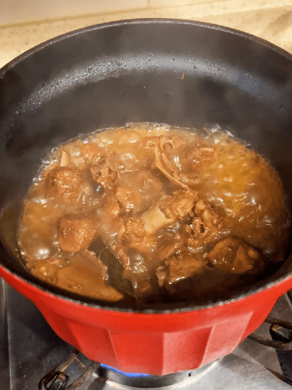 6、炖30分钟,打开盖子收汁,加蒜瓣、葱段、青红辣椒点缀。
