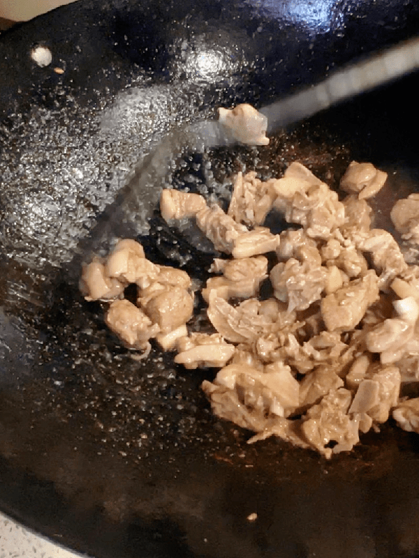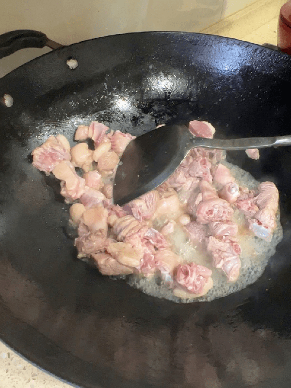 2、铁锅内不放油,直接将鸭肉放入煸干水分,这一步能增香提鲜,既保持鸭肉的风味又不会让它有难闻的味道。