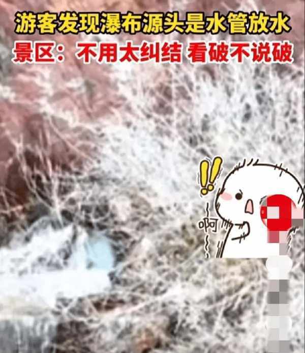河南郑州,游客去某景区游玩,发现一个“奇特”的瀑布。游客来到泉水边,看到山上流下来的水有个白色水管,瞬间明白过来。景区回复称:不用太纠结,看破不说破!