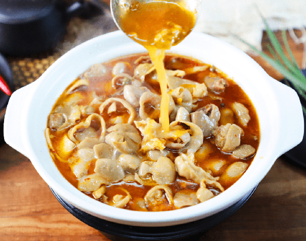 这款食在荆楚肥肠牛肚火锅,不管选用食材还是熬制汤底都是用心满满。鲜气十足的汤底将胶质满满的鱼肚和软软的肥肠团团包裹住,鲜上加鲜,汤底散发着诱人的油光,让人食欲大增。肥肠软粑入味,鱼肚入口鲜而不腥,满嘴都是胶原蛋白。