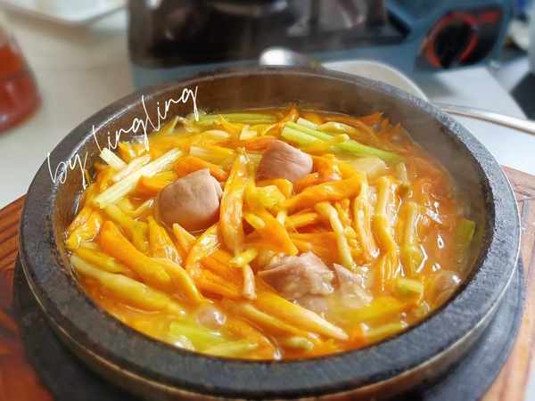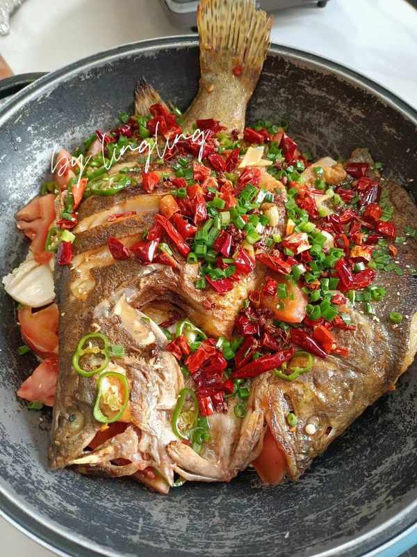 金椒水库桂花鱼:锅底垫上番茄,平铺的大桂鱼表面煎至金黄,上洒红干辣椒,上桌后再炖个三、五分钟,香气诱人,口感鲜香,肉质细腻。