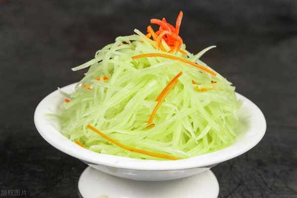 2.起锅烧油,加热至6成热,放入大蒜爆香,等颜色发黄之后放入莴笋丝,大火爆炒两分钟,加入盐、鸡精。