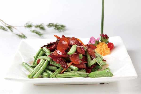 食材:扁豆,腊肠,葱,姜,蒜,盐,植物油,鸡精。