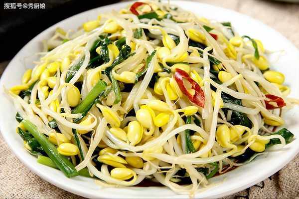 2.热锅烧油,放入葱、姜、花椒粒和干红辣椒炒香,放入豆芽,大火翻炒。
