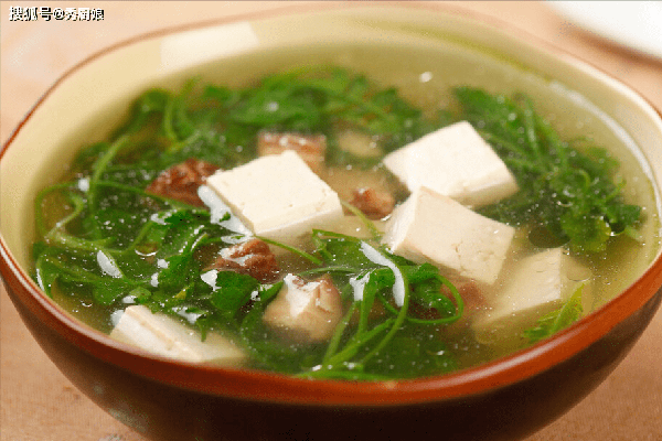 3.放入豆腐和荠菜,加盐调味,中火煮5分钟后,关火,加点鸡精和葱花,即可食用。