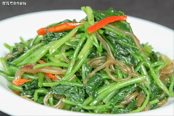3.热锅烧油,放入葱、姜、干红辣椒炒香,放入菠菜和胡萝卜丝,翻炒均匀后,放入粉条,加盐调味,翻炒均匀后,关火,加入少许鸡精,翻炒均匀,即可出锅。