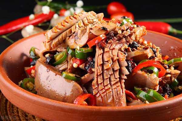 4.把其他的配菜全部都切成小块,放入碗中,加入生抽,蚝油,白糖,香醋,料酒,花椒,鸡精,炒锅中倒油,加热至6成热,放入豆瓣酱,葱,姜,蒜,干辣椒炒出红油,再放入其他配菜和腰花爆炒成熟。