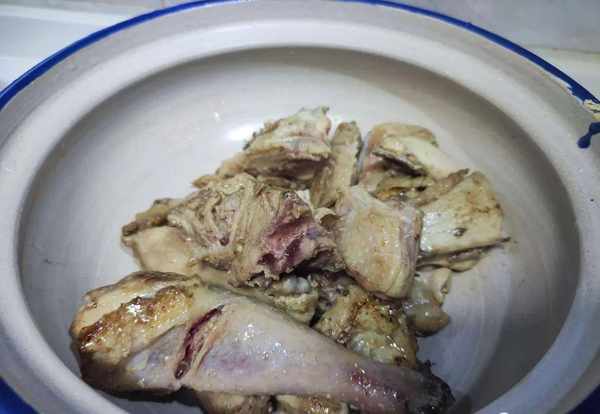4.炒香之后我们准备一个干净的炖锅,将炒好的鸡肉放入炖锅里面;
