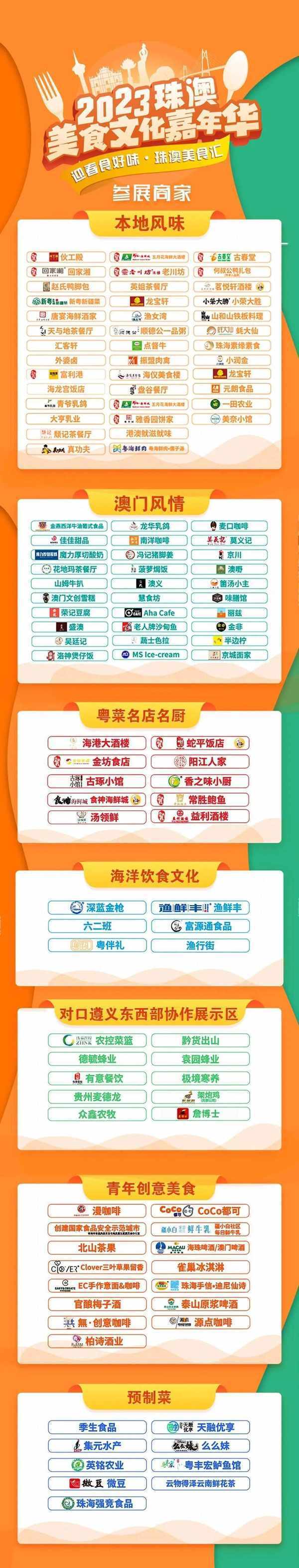 本次嘉年华共打造了 本地风味、澳门风情、粤菜名厨、海洋美食、青年创意、特色预制菜、对口遵义东西部协作七大展区,将娱乐休闲、艺术文化、餐饮服务等业态进行有机融合,着力打造沉浸式的餐饮消费场景体验,探索兼具先锋与本土化相融的城市生活。