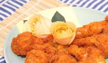 4、面粉加淀粉可以使表皮又酥又脆,只有面粉不脆,只有淀粉不酥。面糊稀一些,微微挂上一些即可,否则厚厚的一层面皮。不挂糊表皮比较硬,口感不好。