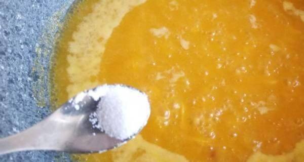 5.将水倒入南瓜泥中,用勺子将南瓜泥充分搅拌