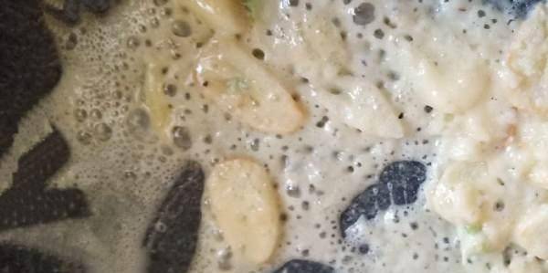 4、炒锅加油,放入蒜片炒香,倒入面粉炒至微黄成糊状,倒入适量水(加少许面粉炒香)油炸,香气浓郁,可以代替高汤)