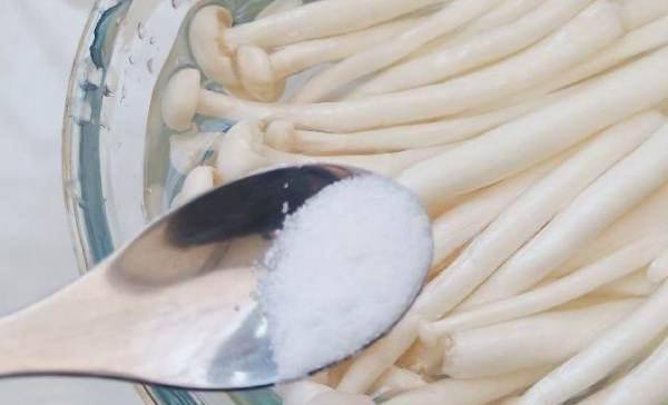 3、白玉菇去根洗净,放入清水中,水中加少许盐浸泡10分钟,水中加少许盐杀菌去异味