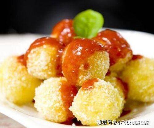 6.锅里放油,油热到60%时,放入沾了面包屑的土豆,炸至金黄色。7.锅中留少许油,加入番茄酱,待番茄酱冒泡时,淋在烤土豆球上即可。