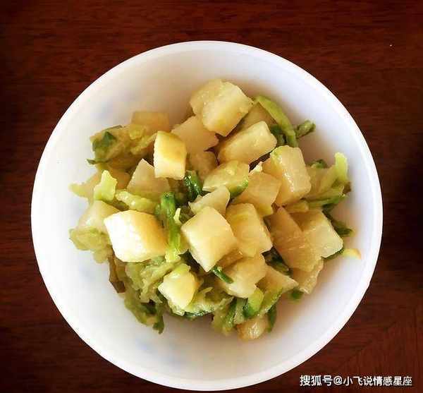 1、用嫩白菜叶,去蒂,用刀轻拍,切丁,洗净沥干,加少许盐腌制,挤干水分备用。