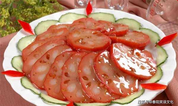 2.取出莲藕,放入水中刮去外皮,取出胶囊,将莲藕切成0.5厘米厚的片,放入大碗中,加入糖和桂花,盖上碗盖密封盖上玻璃纸,放在蒸笼上用小火蒸,1小时30分钟后取出,倒扣在盘子上即可食用。