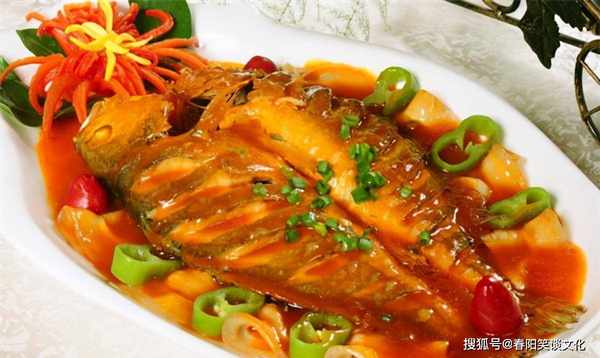 2.炒锅开大火,油70%热时,将鱼放入锅中,炸至金黄色,捞出,锅中留底油烧热,放入葱、姜、蒜入锅,炒匀酱油,加入酱油、醋、精盐、味精、糖、料酒,放入鱼,加入鲜汤(没过鱼身),大火烧开烧热,转小火炖20分钟;